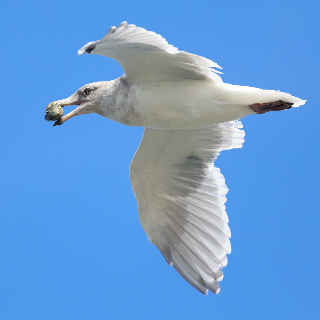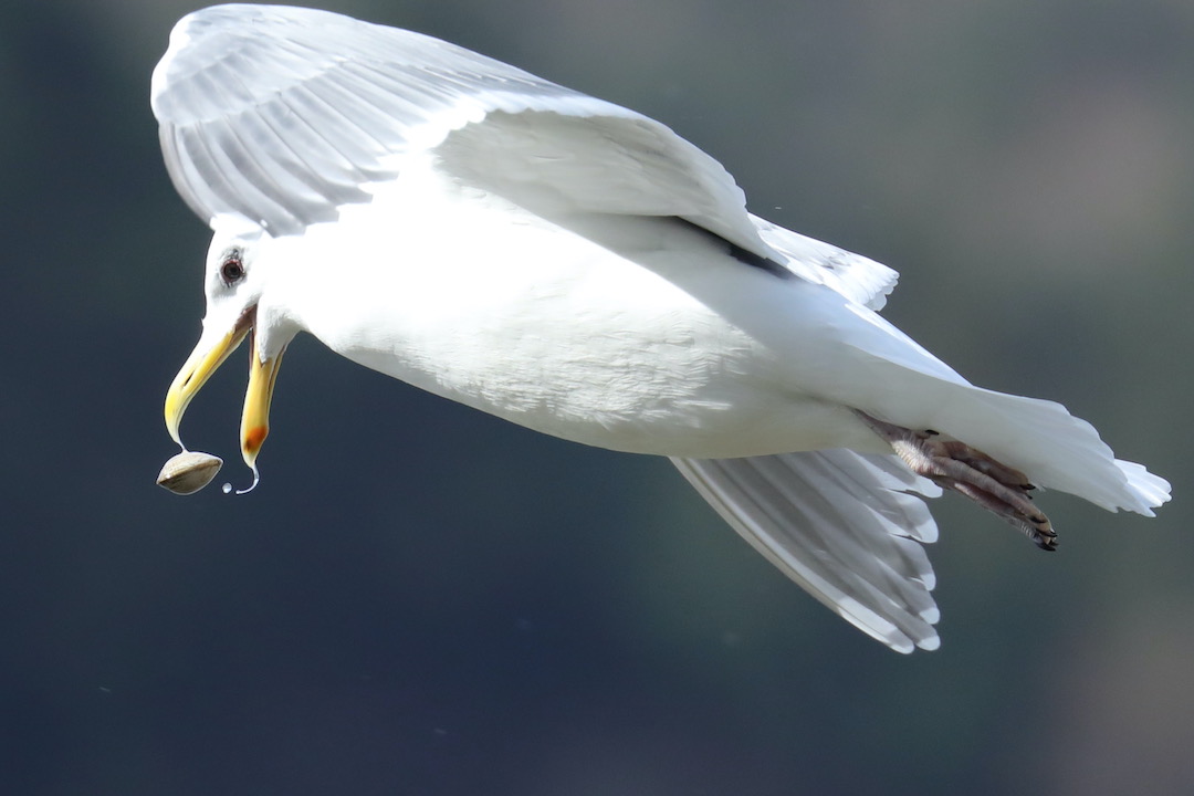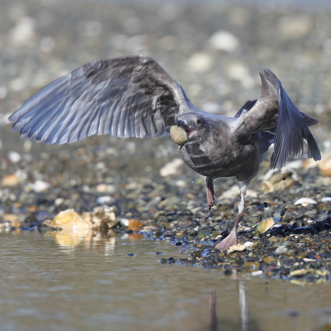 Common year-round on the coastlines from Alaska to Washington, these gulls feed on a variety of things from animals to garbage. One trick they’ve learned is to fly up into the air with a clam and drop it. After the clam slams into the ground, it has a harder time staying closed, so that the gull can eat it.