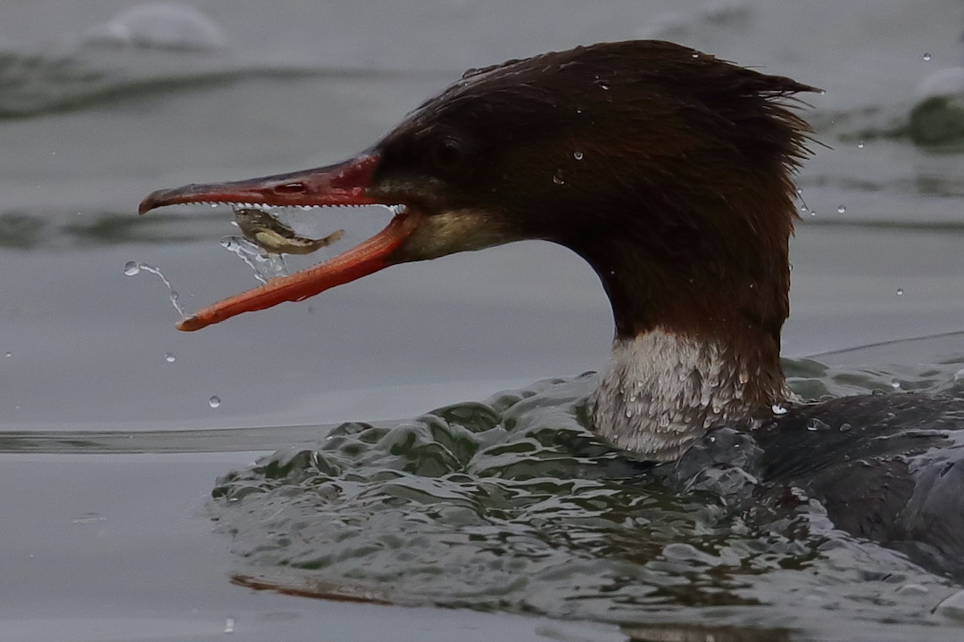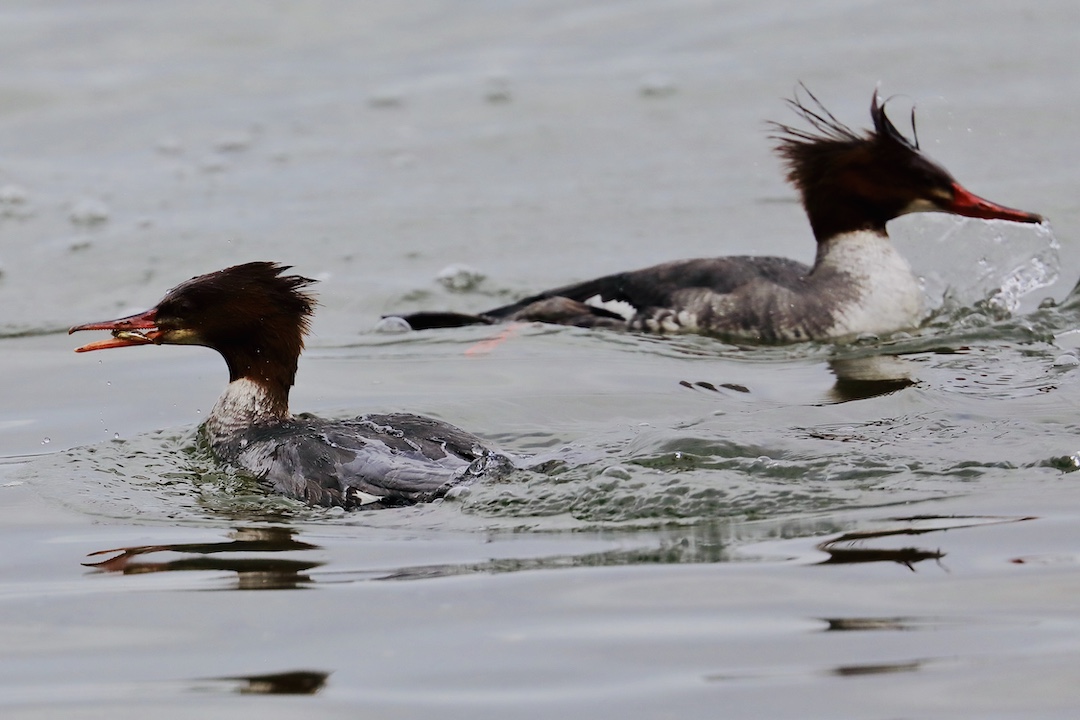 Red-breasted mergansers are fish eating ducks. They are diving ducks that pursue their prey under water, catching it in their bills and bringing it to the surface to eat. These ducks are easy to identify because of their serrated bills. The red-breasted merganser, unlike the common and hooded mergansers, nests on the ground and not in tree cavities.