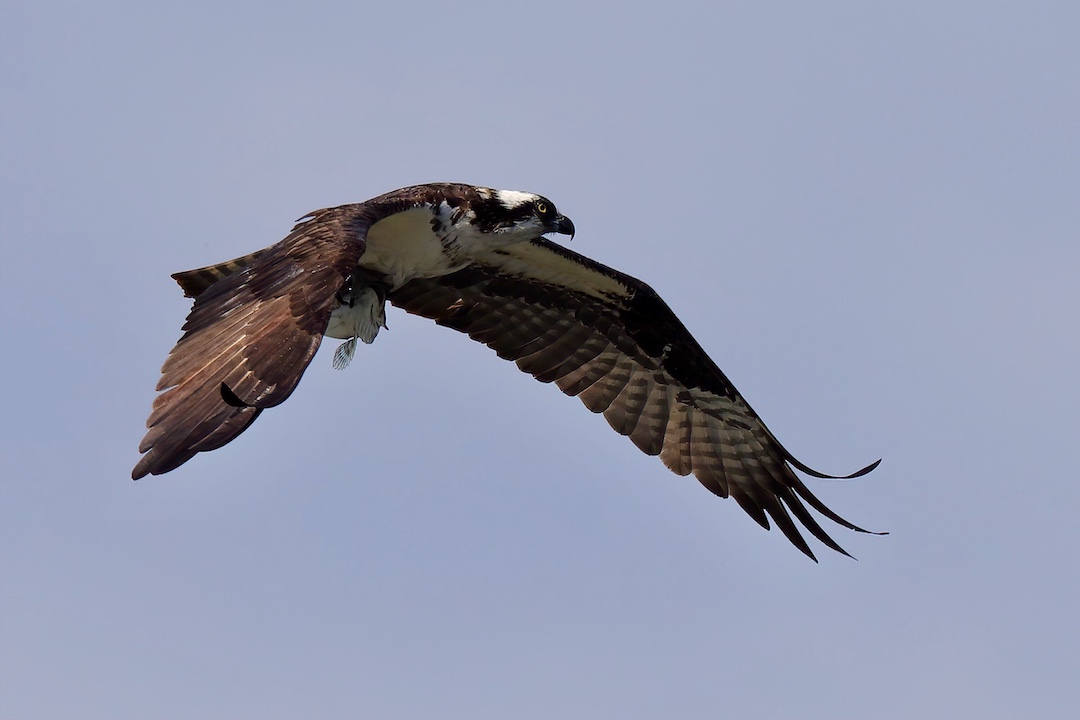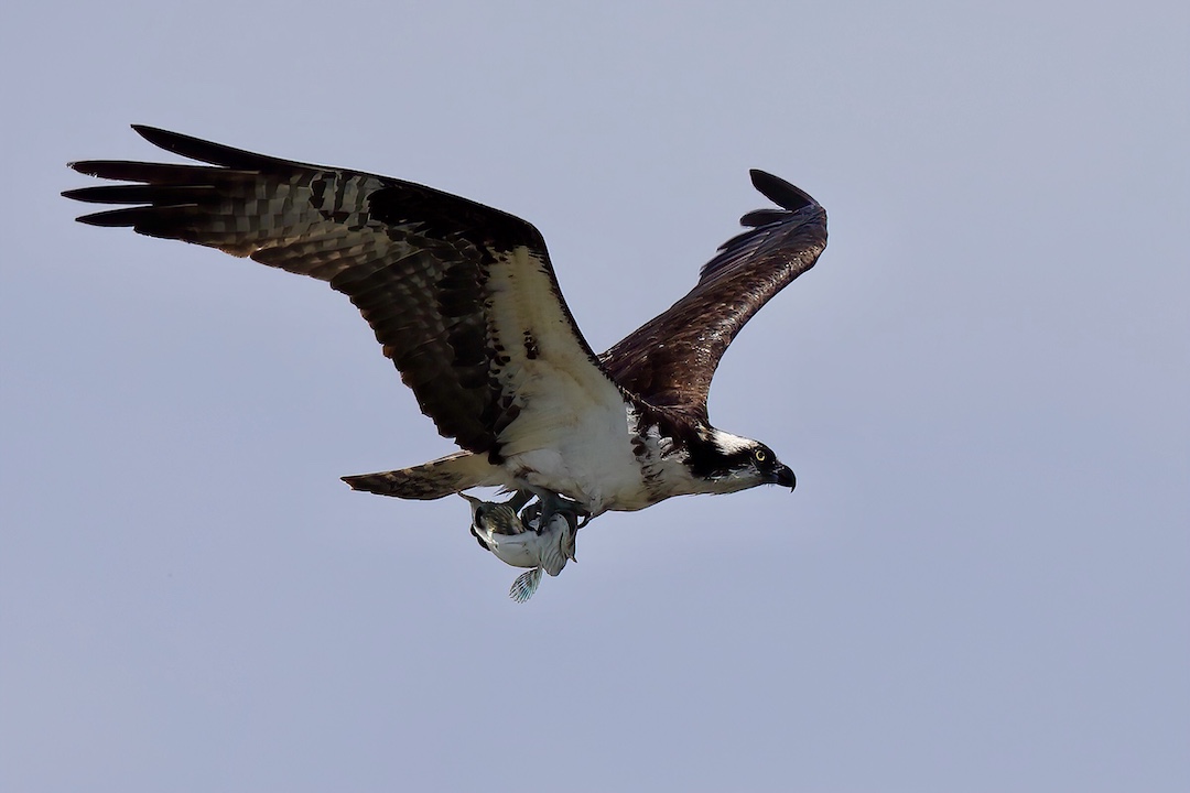 The osprey is a large, mostly white raptor with dark brown plumage along its upper back and wings. These birds can often be seen flying over the shoreline of lakes, rivers and bays. They are adept hunters, diving out of the sky directly into the water with their talons extended, catching fish just below the surface and flying off with a fish clutched in their talons. You can find their nests on top of channel markers, utility poles, or tall snags (dead trees).