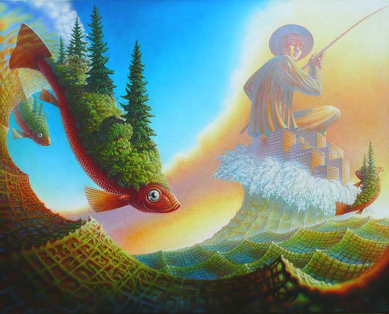 His paintings are inspired by an interest in history, travel and the plight of the contemporary human condition. He creates colorful surrealist compositions that utilize humor and drama in a multi-layered commentary of the present moment.