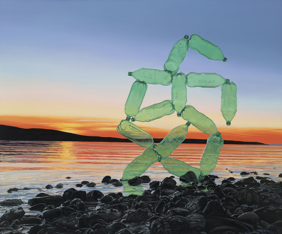 In my latest paintings, I riff on the ideas of 19th Century naturalist Charles Darwin. My painting of a plastic bottle-dog, Primordial PETE, steps out of the primordial ooze of the Plasticene Era to troll artist Jeff Koons. For this series, I assemble discarded green PETE plastic bottles to create models of post-apocalyptic sea creatures that I imagine evolving from the toxic soup of plastics and chemicals we humans have dumped into our oceans, as in my painting Theory of Evolution.