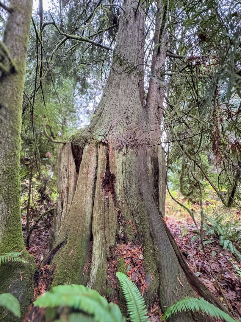 And speaking of old stumps rotting away, here is another view of that same tree. It is tilting toward the camera, so we’re seeing the rotten part of the stump. But also visible are strong roots growing around the rotten part, and they are holding the tree up.