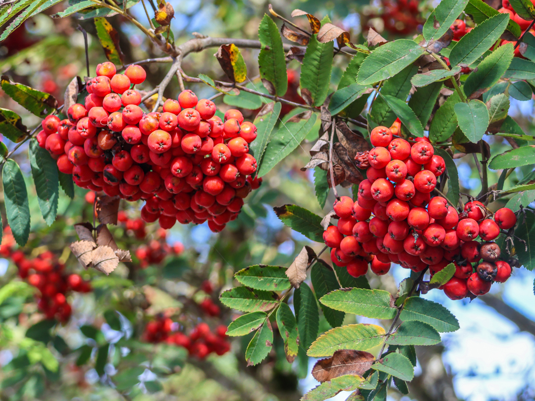 Mountain ash is also known as the rowan tree. The European mountain ash (Sorbus aucuparia) is native to Europe and Asia. It was introduced to North America as an ornamental garden species and is now widespread around the Salish Sea region, particularly in sunny spots with well-drained soils.