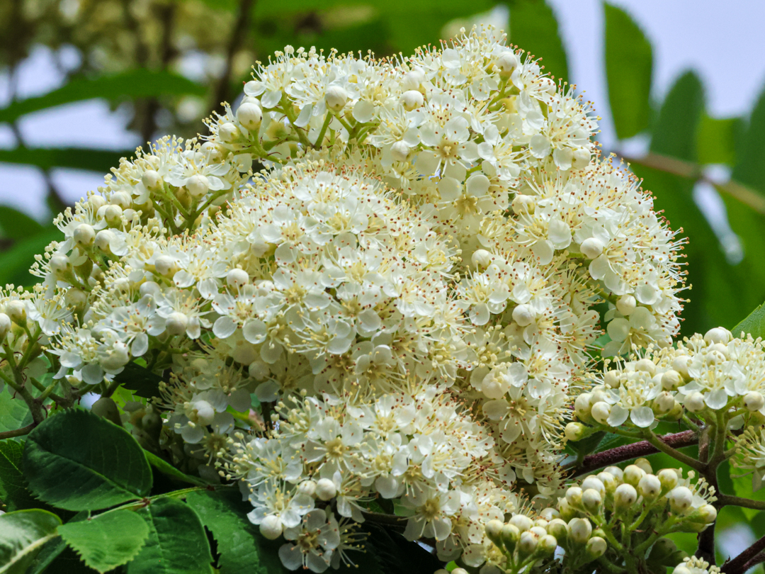 By spring each year, clusters of frothy white flowers appear, like fairy umbrellas, all over the tree. By late summer, the mountain ash is laden with dark-orange berry clusters, many branches bent toward the ground under the weight of so much fruit. Through fall and winter, the berries wrinkle and darken, and crowds of robins descend on the overripe bounty.
