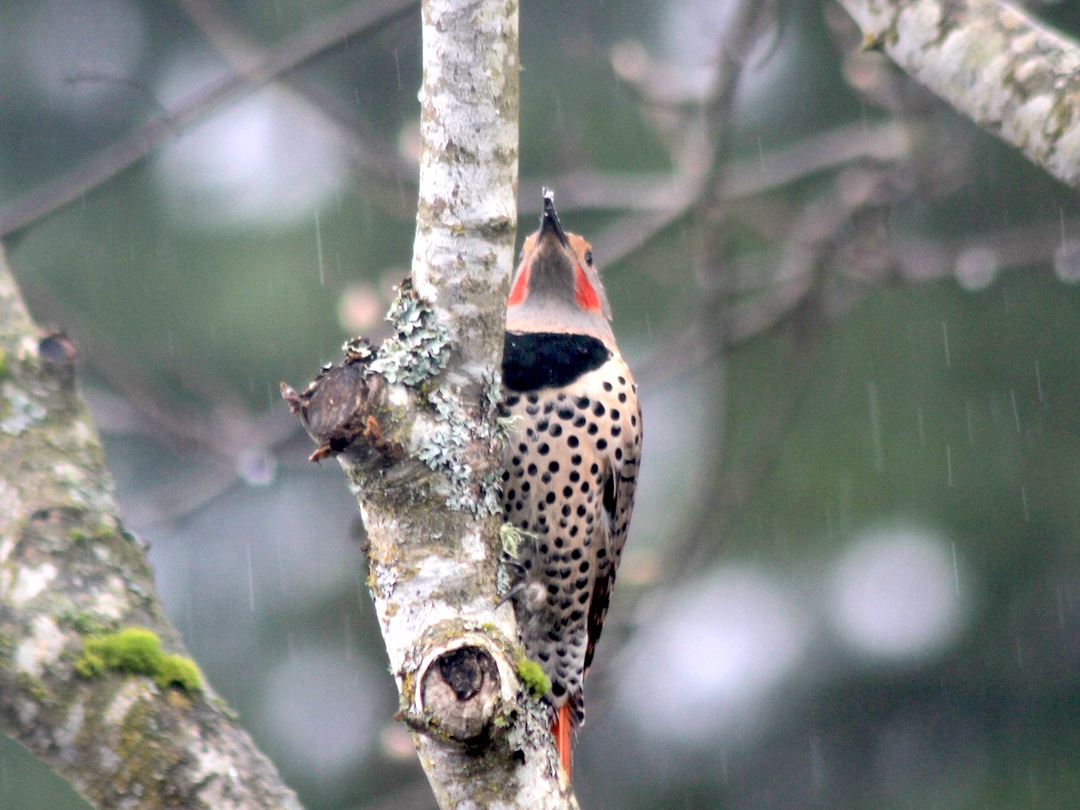 In our front yard is a year-round grocery store and rest stop for wild travelers. It started twenty-plus years ago, when a bird flying overhead made a berry-laden fecal deposit in the flowerbed. A seed sprouted from the poo-enriched soil, sending up a woody twig with bright green, lacy leaves. Within a few more seasons, a sturdy European mountain ash sapling was well established. After two decades, it is a mature tree, with multiple trunks and many branches reaching up into the power lines and spreading a shady canopy over lawn and driveway. Mosses and lichens encrust the tree’s branches, harboring invertebrates. Tidy rows of holes around the trunks provide evidence of woodpeckers at work.
