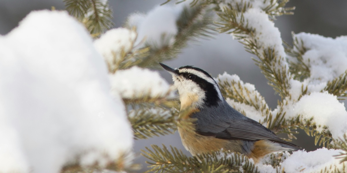 Red-breasted nuthatch on a spruce bough. photo by Gary Fultz on Unsplash