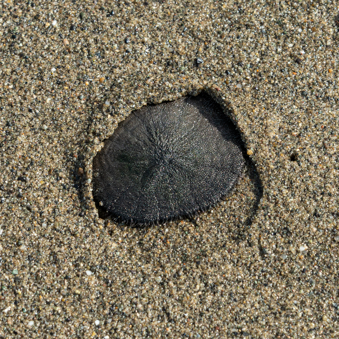 Looking more closely, I could see that the disturbances in the sand were sand dollars. Yes, I am showing sand dollars again! They are some of my favorite friends to photograph. Here’s also a photo of a young one which was isolated, just beginning to dig into the sand.