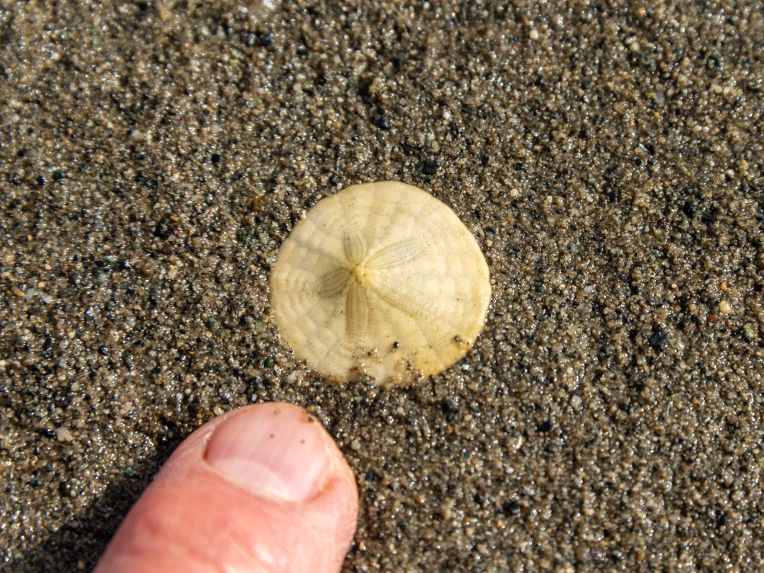 Here is a young sand dollar who died before it had a chance to grow larger. Without the black spines and tube feet, it’s easier to see the eccentric 5-lobed shape on it that leads to it being called an eccentric sand dollar.