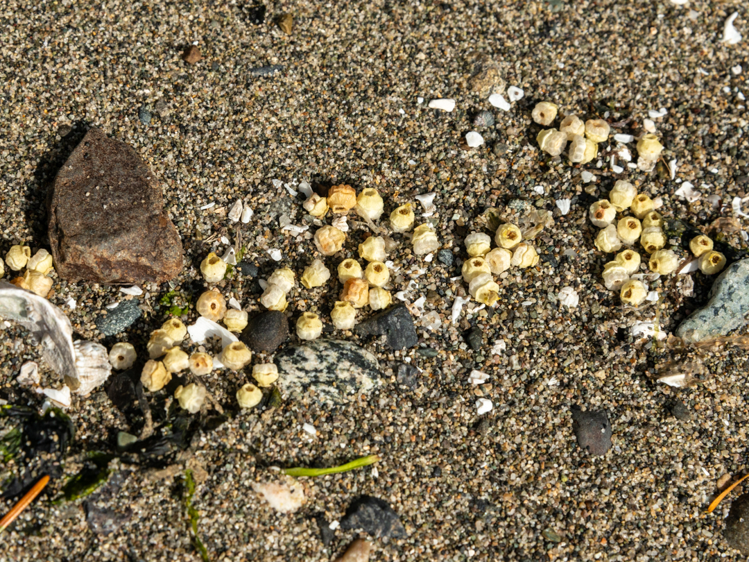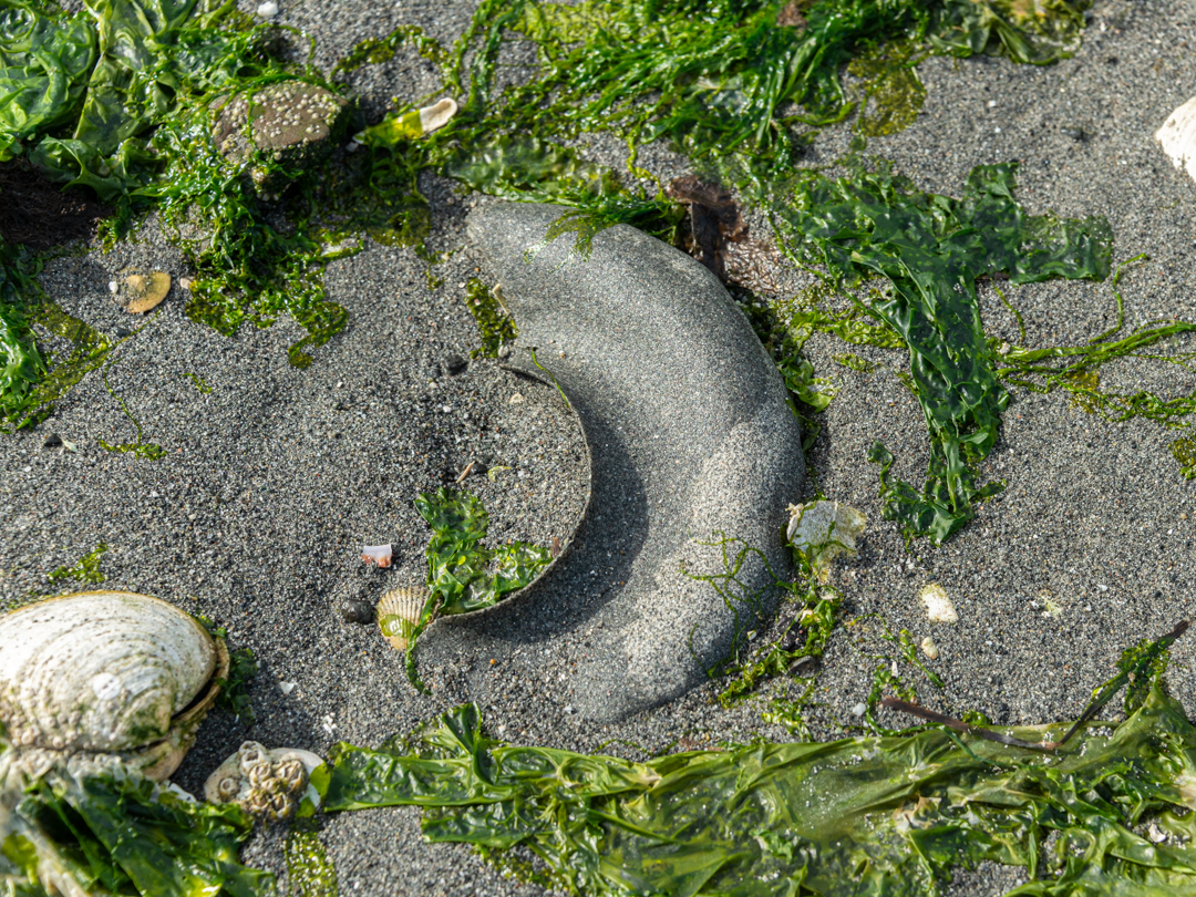 And the sandy parts of the beach contained many of the ususal performers, including a variety of shells and seaweed. Sometimes, like with this moonsnail shell, it seemed as if they were performing together.