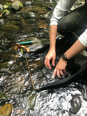 A Stream Team Member collects a sample of benthic macroinvertebrates using a Surber sampler tool.