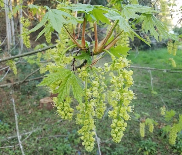 For months now, damp bark is a conduit for rain running into the mat of moss below. Bare and bold branches boast the Bald Eagle, but by February I bike beneath buds, the air scented with nearby sarcococca. New leaves, and pendant flowers of spring are in the air. Samaras, the winged achene seeds, helicopter to the trail. I spin my wheels around with joy.