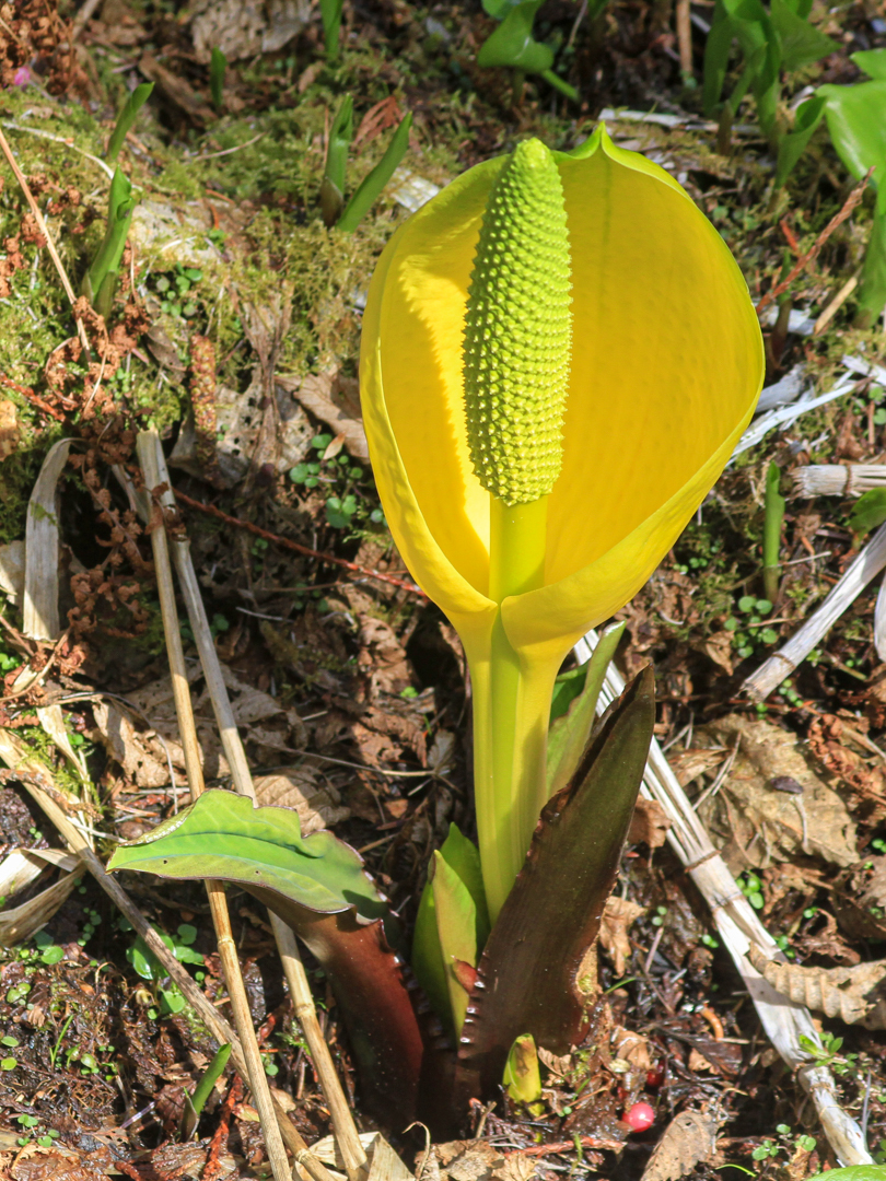 American skunk cabbage (Lysichiton americanus) is more poetically known as swamp lantern. A true wetland plant, its roots must be saturated year-round. It’s ideal habitat is a pocket of deep, mucky soils in a low spot in the forest, or in a groundwater seep on a shady hillside. The roots often grow to a depth of a foot or more and form a large rootball. The leaves of skunk cabbage continue to grow through the summer and become quite large before dying back in the fall.