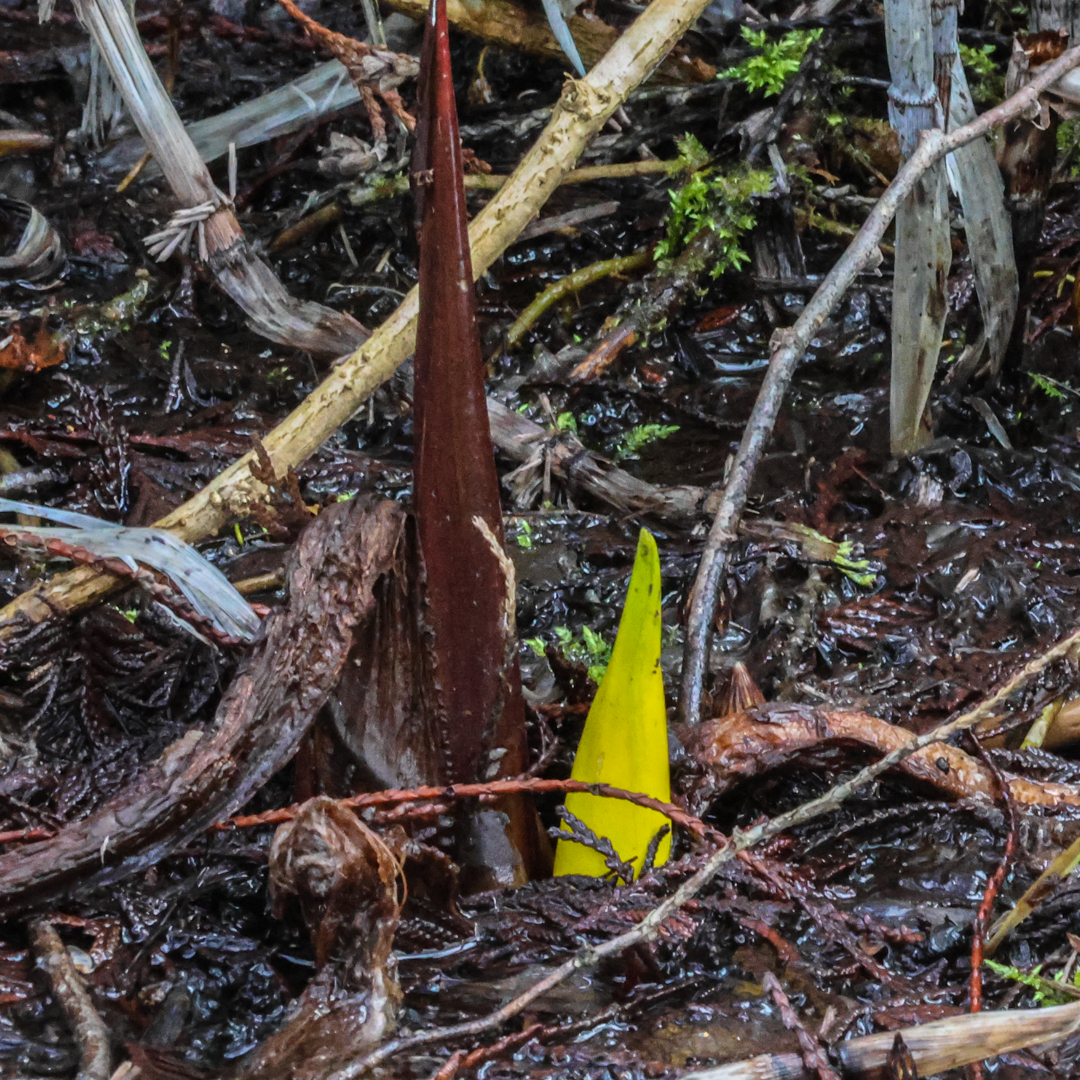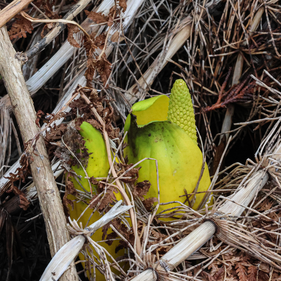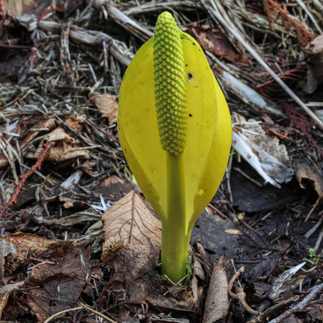 Bright yellow spikes start to unfold, revealing a nubby cylinder inside. Is it alien, plant, or plastic? If there’s a doubt about the organic nature of this being, the smell confirms it is indeed alive and doing something chemical. Particularly on a warm spring day, with a big patch of the yellow spikes on full display, that aroma wafting across a forest trail makes it easy to understand why people named them skunk cabbage.