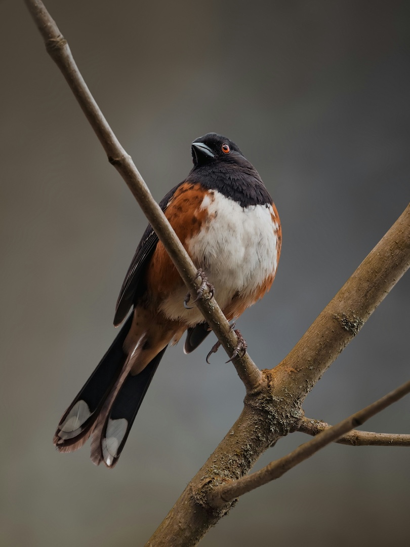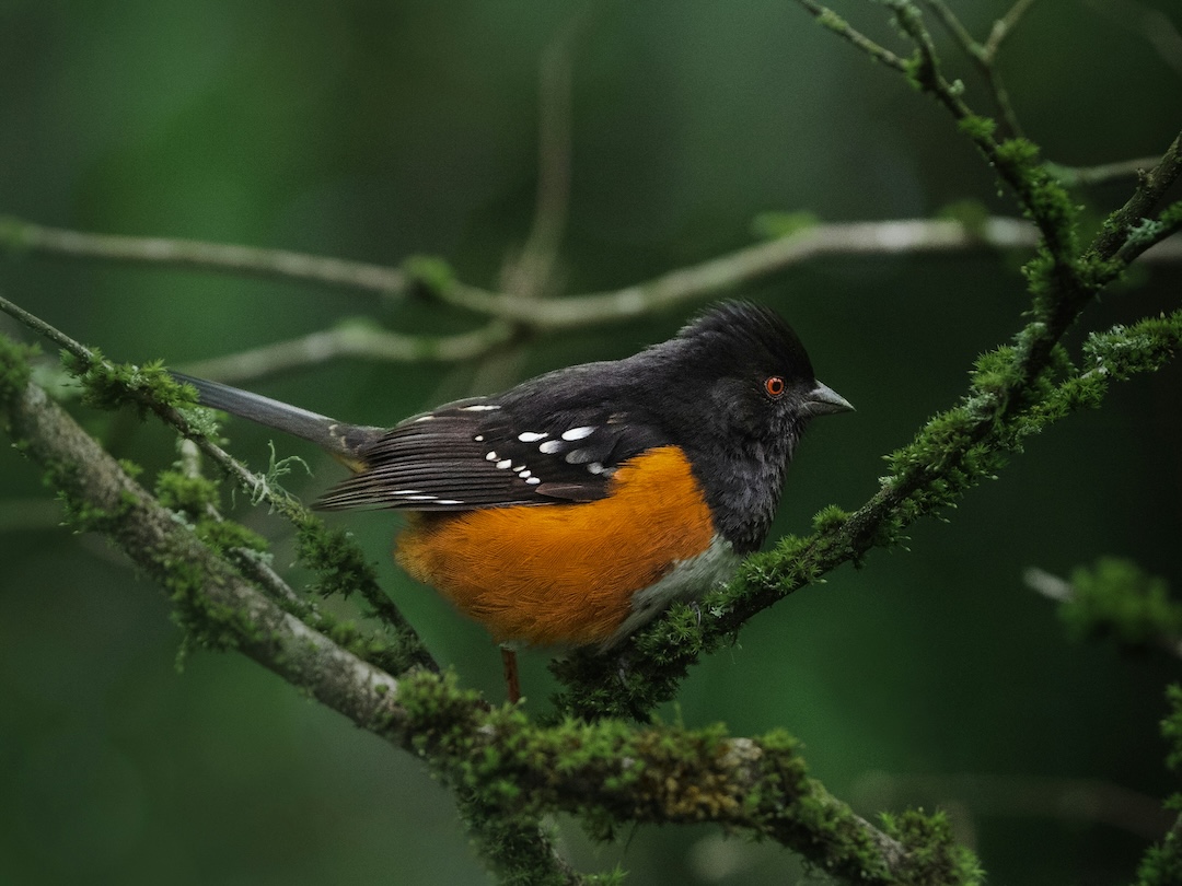 It was a beautiful bird. I could try to describe the colors, the delicate patterns of its feathers, or the fire engine red of its eyes. But I don’t think my description would do the bird justice. I could try to describe the deep black of its hood flowing down to its shoulders or its bold, white spots set against the shiny black of its wings. I could attempt to describe the terra cotta color of its flanks juxtaposed against the downy, white feathers of its breast and belly. I could talk about its white-tipped, fan-like tail that flares wide when the towhee is perched on a fence post. You can google it. I did, and I learned that the male spotted towhee spends up to 90% of its time, singing to attract a mate. I learned that a lot of towhees together are called a tangle or a teapot. I like that. A tangle of towhees. A teapot of towhees.